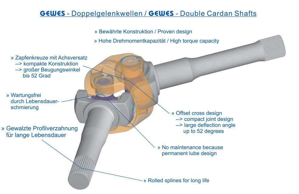 GEWES предоставляет подходящие приводные валы для этой цели; включая двойные карданные валы для осей тяжелых транспортных средств, а также для заднего моста и приводных валов